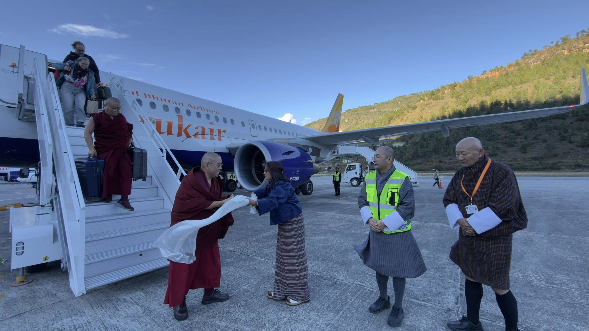 H.E. Kyabjé Ling Rinpoche arrived in Bhutan and received a grand and warm welcome at Paro International Airport from Ms. Ugen Chozom, Chief Protocol Officer of the Royal Government of Bhutan, along with senior government officials, Kalu Rinpoche, and Thupten Rinpoche.