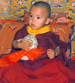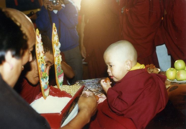 The 7th Kyabjé Yongzin Ling Rinpoche’s discovery was one where the child clearly recognized a member of the search party. In August 1987 members of a search party visited the Tibetan Children’s Village baby room and asked a caretaker to see a boy called Tenzin Choephag. She pointed to the child, who was already holding one of the search party member’s hand. Although he was only 18 months old, Tenzin Choephag called the person by name.