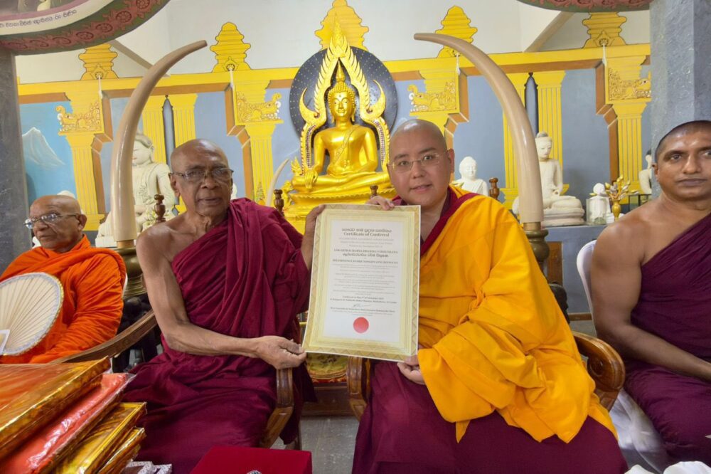 ࿑ ༸སྐྱབས་རྗེ་ཡོངས་འཛིན་གླིང་མཆོག་སྤྲུལ་རིན་པོ་ཆེ་མཆོག་གིས་ཤྲིར་ལངྐའི་ཡུལ་དུ་མཛད་འཆར། ༡༽ སྔ་ལོ་ཕྱི་ལོ་ ༢༠༢༤ ལོ་དྷ་སར་༸གོང་ས་༸སྐྱབས་མགོན་ཆེན་པོ་མཆོག་ལ་སྲིད་ན་རྙེད་པར་དཀའ་བའི་སངས་རྒྱས་ཀྱི་རིང་བསྲེལ་རིན་པོ་ཆེ་ཕུལ་བའི་བཀའ་དྲིན་རྗེས་དྲན་དང་། འདི་ལོར་༸གོང་ས་༸སྐྱབས་མགོན་རྒྱལ་དབང་ཐམས་ཅད་མཁྱེན་ཅིང་གཟིགས་པ་ཆེན་པོ་མཆོག་དགུང་གྲངས་༩༠ ལ་ཕེབས་པའི་སྐུའི་གོ་སྟོན་སྲུང་བརྩིའི་སླད་དང་། མགོན་པོ་གང་ཉིད་བདག་སོགས་བསྟན་འགྲོའི་མགོན་དུ་སྐུ་ཚེ་ཞབས་པད་བསྐལ་བརྒྱར་བརྟན་ཅིང་མཛད་འཕྲིན་ཕྱོགས་བཅུར་རྒྱས་པ་དང་། བོད་རང་དབང་བདེན་པའི་ཉི་མ་མྱུར་དུ་འཆར་བའི་སླད་དུ་ཤྲཱི་ལངྐའི་ཡུལ་དུ་ནང་ཆོས་ཐོག་མར་སྲོལ་གཏོད་མཁན་ཆོས་ཀྱི་རྒྱལ་པོ་ཨ་ཤོ་ཀའི་རྡོ་རིང་གསར་བཞེངས་ཀྱི་མཐུན་འགྱུར་གསོལ་སྩལ་དང་། མཛད་སྒོའི་དབུ་བཞུགས་སུ་ཆིབས་བསྒྱུར་དང་། སངས་རྒྱས་ཀྱི་རིང་བསྲེལ་མཇལ་ཞུ་དང་ཐུགས་སྨོན་མཛད། ༢༽ ཤྲཱི་ལངྐའི་ནང་དུ་ཆོས་བརྒྱུད་ཆེན་པོ་༼སི་ཡམ་ནི་ཀ་ཡ། ཨ་མར་པུ་ར་ནི་ཀ་ཡ། རཱམནྱ་ནི་ཀ་ཡ་བཅས་༽གསུམ་ཡོད་པ་ལས། ད་ལན་ཨ་མར་པུ་ར་ནི་ཀ་ཡའི་ཆོས་བརྒྱུད་ཀྱི་ཐོག་ནས་༼འཇིག་རྟེན་དོན་དུ་སློབ་དཔོན་ཆོས་ཀྱི་རྣམ་རྒྱན།༽LOKARTHACHARYA DHARMA VIBHUSHANA གཟེངས་བསྟོད་ཅེས་པ་༸སྐྱབས་རྗེ་ཡོངས་འཛིན་གླིང་མཆོག་སྤྲུལ་རིན་པོ་ཆེ་མཆོག་ལ་འབུལ་བཞེས་མཛད། གཟེངས་བསྟོད་འདི་བཞིན་ཆོས་བརྒྱུད་དེའི་ཐོག་ནས་དེ་སྔ་འབར་མའི་བླ་ཆེན་ཞིག་དང་། ཐ་ལཎ་ཌིའི་བླ་ཆེན་ཞིག་ལ་འབུལ་གནང་མཛད་འདུག། །ཐེག་པ་ཆེན་པོ་དང་། དེའི་ནང་ནས་བོད་བརྒྱུད་ནང་བསྟན་གྱི་བླ་ཆེན་ཞིག་ལ་འབུལ་བ་ཐོག་མ་དེ་རེད་འདུག། ། ༣༽ ཤྲིར་ལངྐའི་ནང་སེམས་བསྐྱེད་གླིང་ལེགས་སྦྱར་དང་པ་ལིའི་རིགས་གཞུང་སྤེལ་རེས་ལྟེ་གནས་ཁང་དུ་སངས་རྒྱས་ཀྱི་རིང་བསྲེལ་རིན་པོ་ཆེ་གདན་ཞུ་དང་མཆོད་འབུལ་མཛད་སྒོའི་ཚོགས་མགོན་དུ་བཀའ་དྲིན་བསྐྱངས་པ་དང་དེ་བཞིན་༸གོང་ས་༸མཆོག་གི་བདེ་སྐྱིད་ཀྱི་ཉམས་ལེན་ཁང་ཞེས་པ་གསར་བསྐྲུན་གྱི་ས་གཞི་བྱིན་རླབས་དང་ས་རྡོ་རྨང་འཇོག་གནང་། དེ་བཞིན་༸གོང་ས་༸མཆོག་སྐུ་ཚེ་ཞབས་པད་སྲིད་མཐར་བརྟན་པའི་སླད་ཕྱུགས་རིགས་ཚེ་ཐར་དང་། སློབ་ཕྲུག་གི་འཁོ་ཆས་སྦྱིན་གཏོང་གནང་བ་བཅས་ཀྱི་སྐུ་པར།། H.E. … Read more